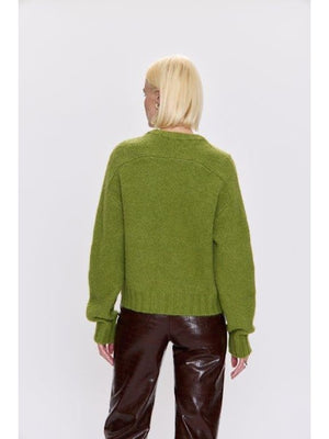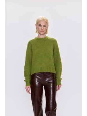 Medium weight, waffle knit sweater. Raglan, long sleeves with monochromatic rib trim at neckline, sleeves, and hem. Designed with an elongated crop proportion and split hem that grazes the waistband.